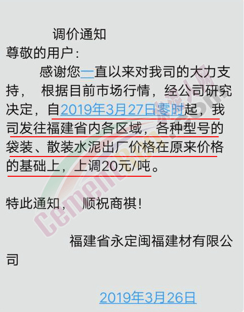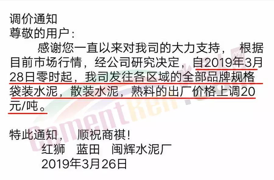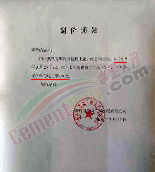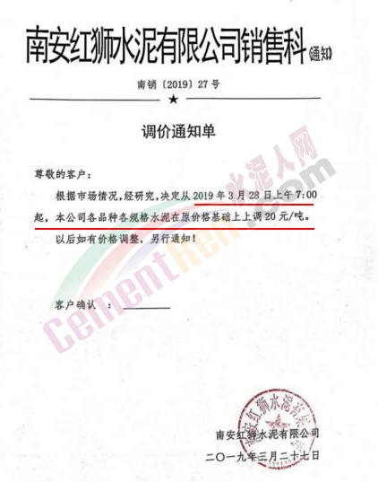 南安紅獅水泥有限公司調(diào)價(jià)通知稱,根據(jù)市場(chǎng)情況 ,經(jīng)研究決定從2019年3月28日上午7點(diǎn)起,各品種各規(guī)格水泥在原價(jià)格基礎(chǔ)上上調(diào)20元/噸。