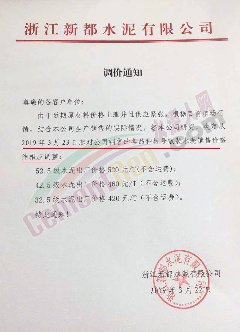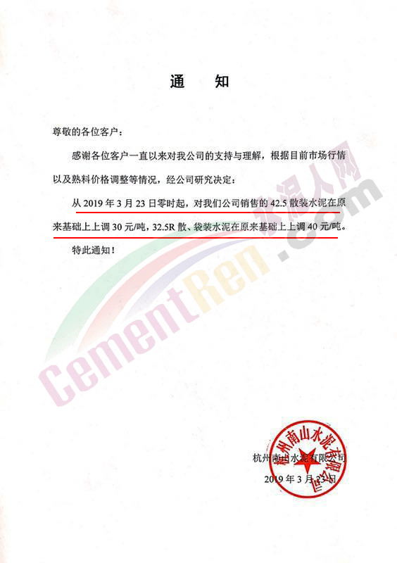 杭州南山水泥有限公司通知稱,從3月23日零時(shí)起,對(duì)我們公司銷售的42.5散裝水泥在原來基礎(chǔ)上上調(diào)30元/噸,32.5R散、袋裝水泥在原來基礎(chǔ)上上調(diào)40元/噸。