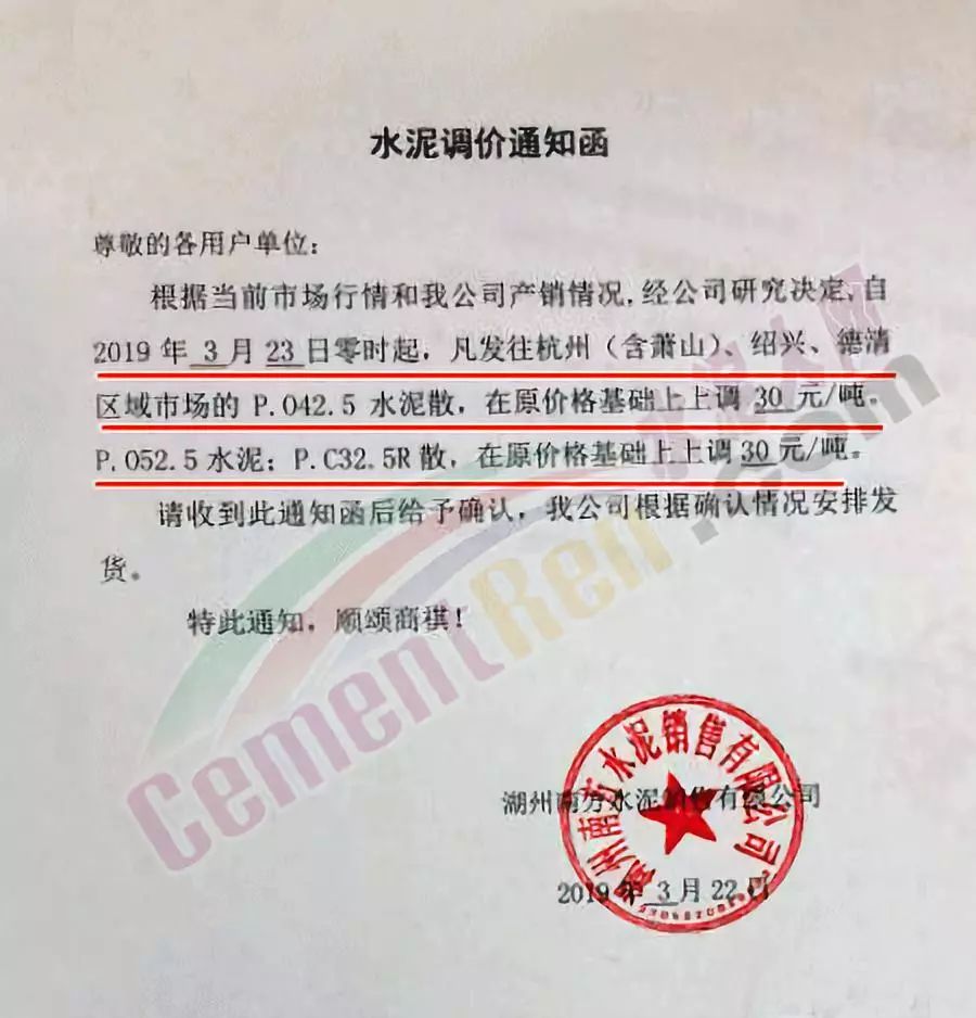 湖州市菱湖三獅水泥有限公司調(diào)價(jià)通知稱,由于熟料等原材料價(jià)格上漲,經(jīng)公司決定 :從3月23日起,32.5水泥價(jià)格每噸上調(diào)20元。42.5水泥價(jià)格每噸上調(diào)30元。