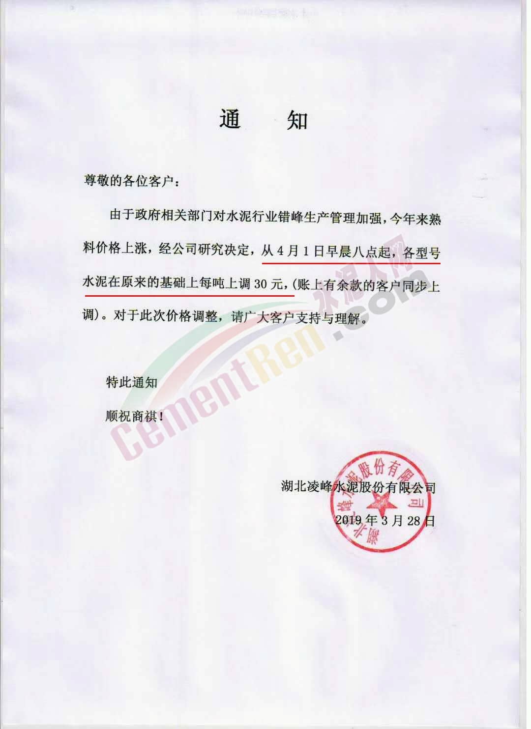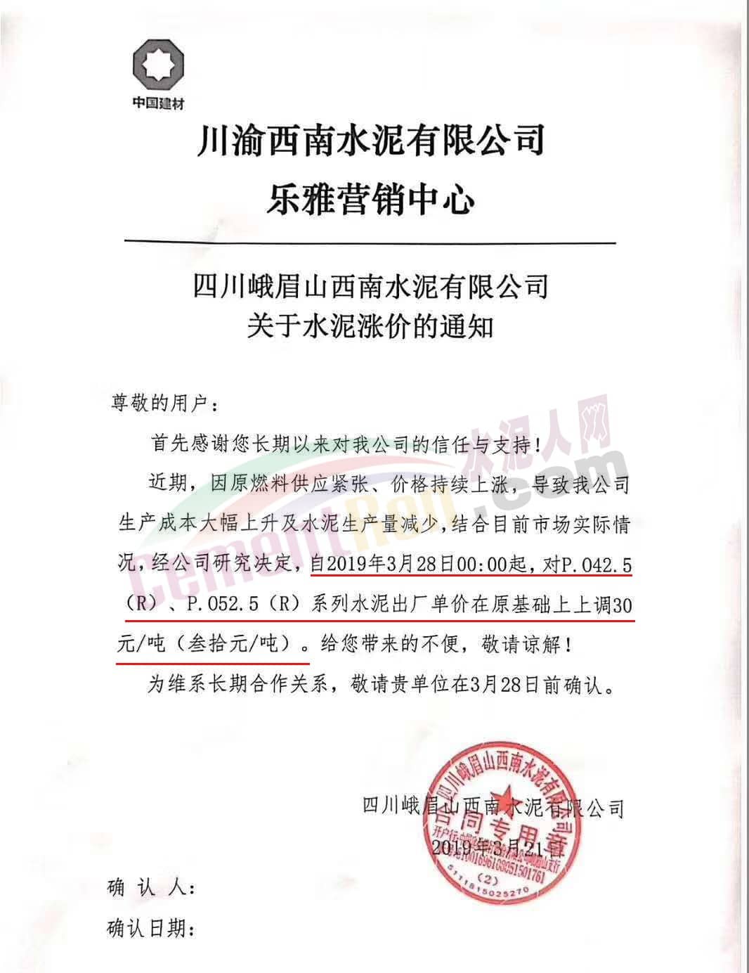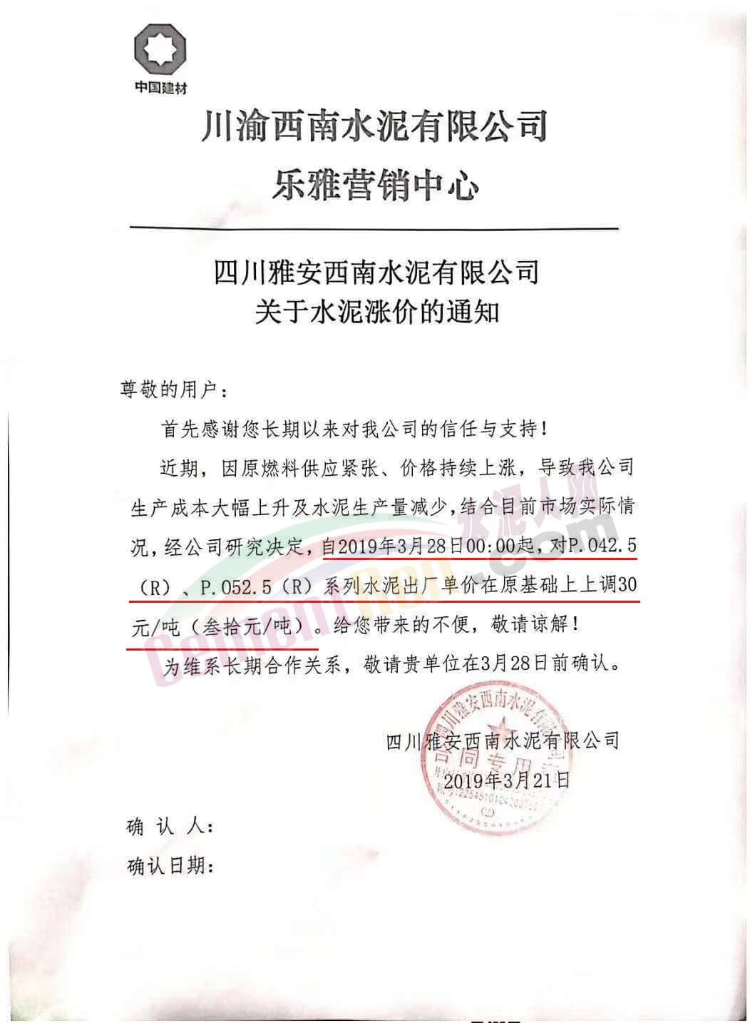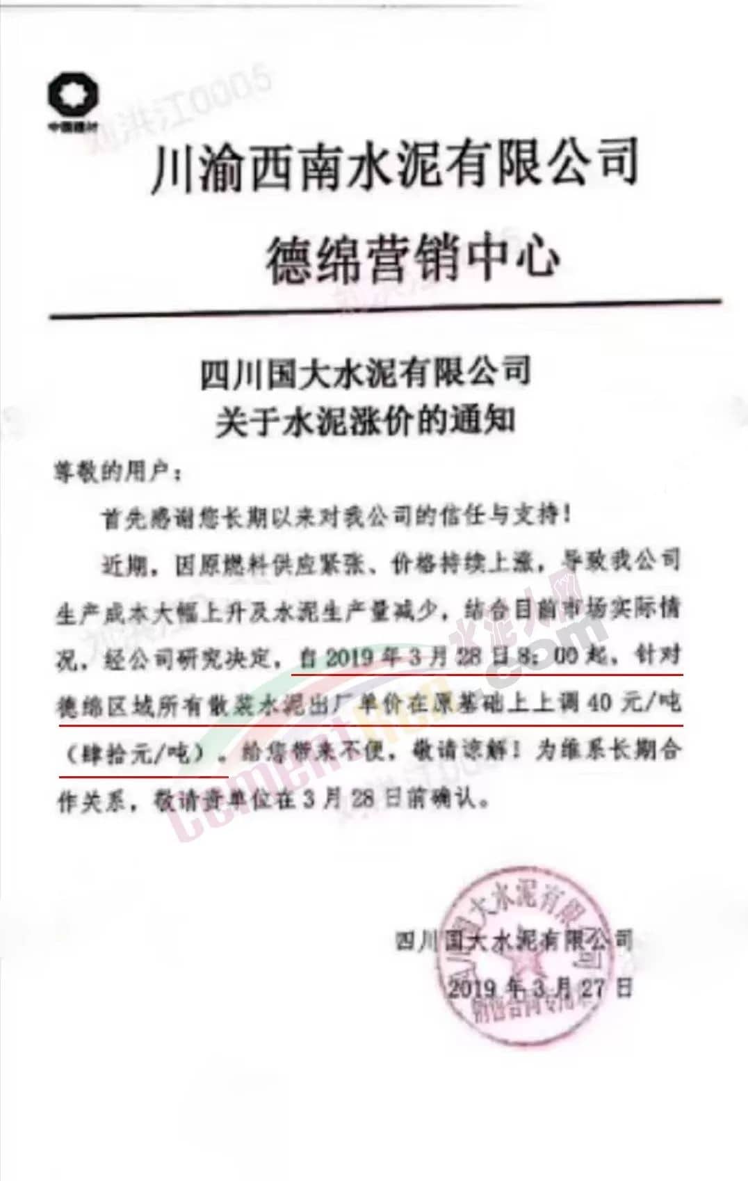 同期,川渝西南水泥旗下多個(gè)企業(yè)也通知自今日(3月有28日)起上調(diào)水泥價(jià)格。