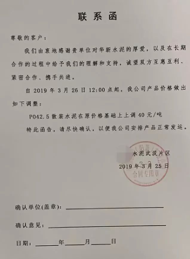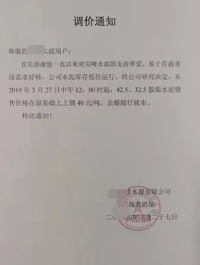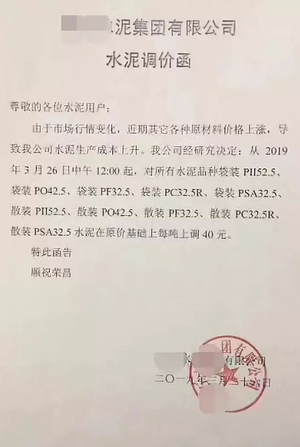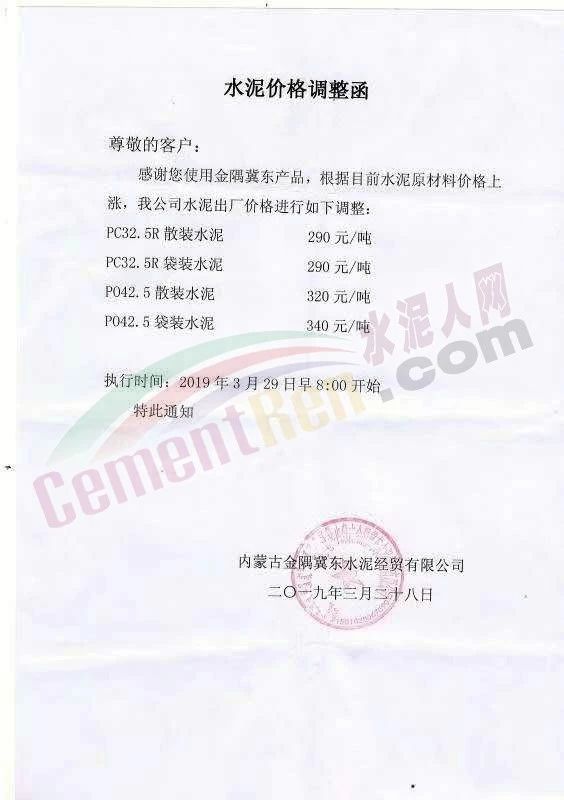 同期,內(nèi)蒙古金隅冀東水泥貿(mào)易有限公司也發(fā)函調(diào)整水泥價(jià)格。