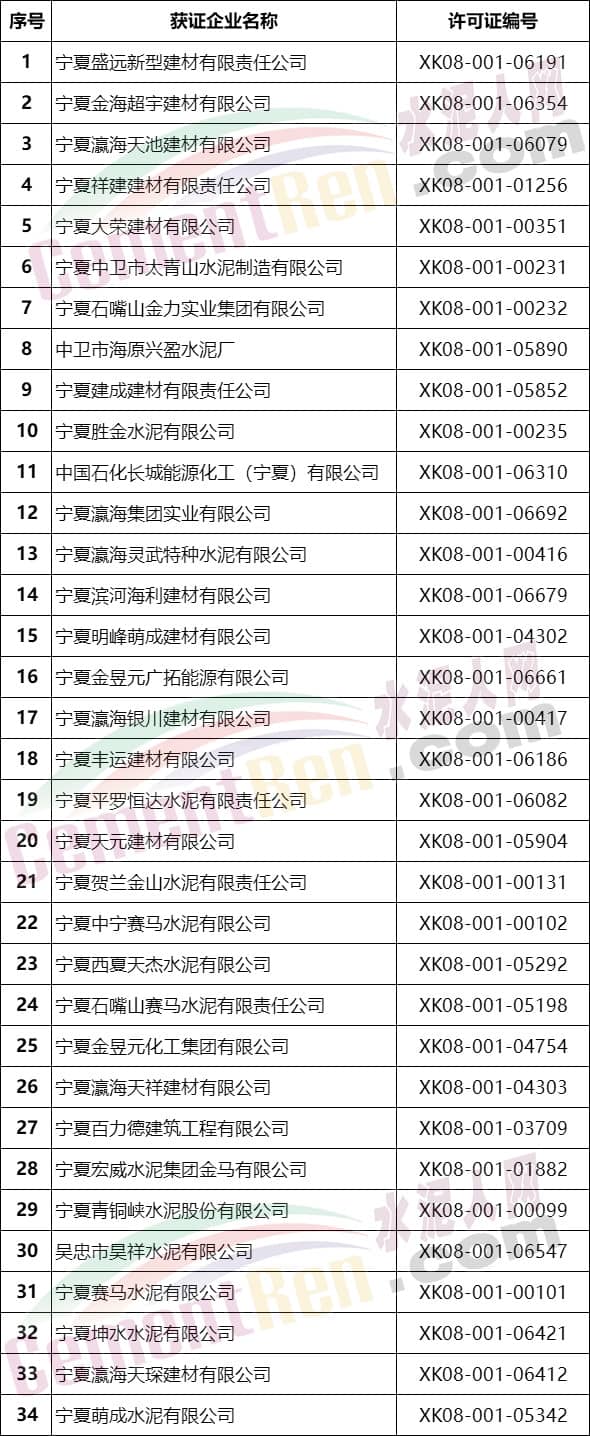 寧夏回族自治區(qū)水泥企業(yè)名單