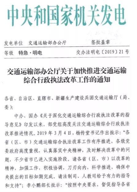 近日,交通運(yùn)輸部辦公廳下發(fā)特急明電,要求加快推進(jìn)交通運(yùn)輸綜合行政執(zhí)法改革工作。