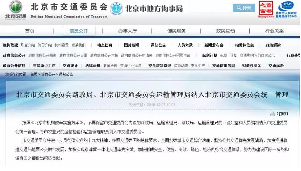 北京市交通委員會(huì)去年12月7日便下發(fā)了《北京市機(jī)構(gòu)改革實(shí)施方案》,不再保留北京市交通委員會(huì)內(nèi)設(shè)的路政局、運(yùn)輸管理局。