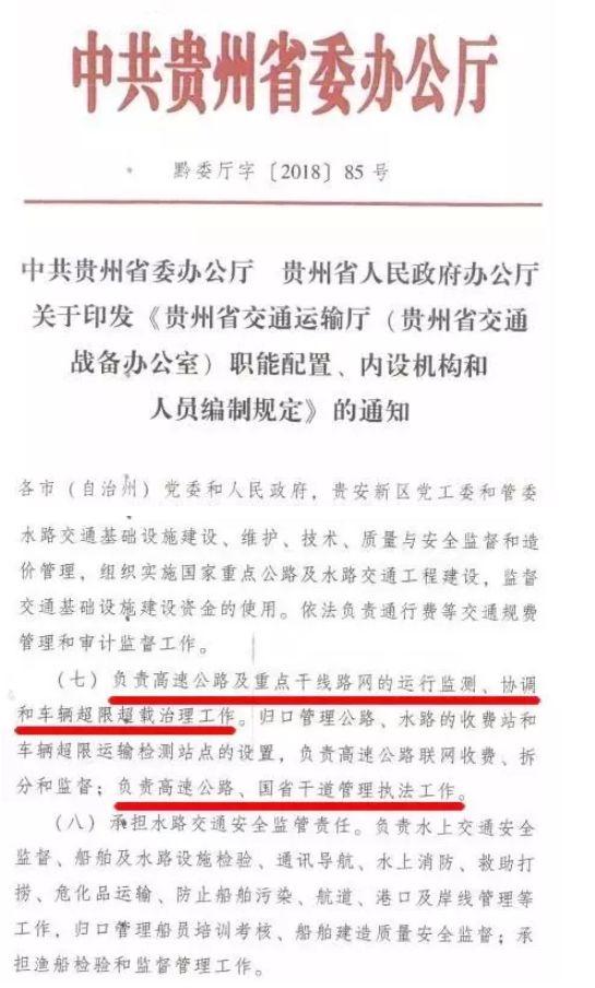 貴州省印發(fā)交通運(yùn)輸廳三定方案,指出負(fù)責(zé)高速公路及重點(diǎn)干線路網(wǎng)的運(yùn)行監(jiān)測(cè)、協(xié)調(diào)和車輛超限超載治理工作。歸口管理公路、水路的收費(fèi)站和車輛超限運(yùn)輸檢測(cè)站點(diǎn)的設(shè)置,負(fù)責(zé)高速公路聯(lián)網(wǎng)收費(fèi)、拆分和監(jiān)督;負(fù)責(zé)高速公路、國(guó)省干道管理執(zhí)法工作。由此可以理解為:貴州的高速公路、國(guó)省道管理執(zhí)法工作,由省垂直管理?