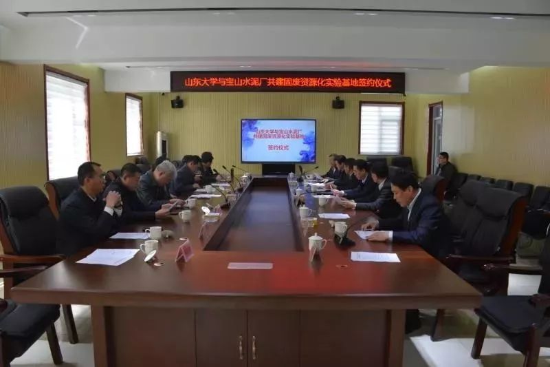 簽約儀式上,淄川區(qū)副區(qū)長趙軍致辭,對山東大學與寶山水泥共建固廢資源化實驗基地簽約表示祝賀,寶山水泥廠董事長賈木海介紹了企業(yè)情況,山東大學能源與動力工程學院黨委副書記滕玉軍介紹了山東大學能源與動力工程學院科研情況,董勇教授介紹了燃煤污染物減排國家工程實驗室情況,王文龍教授介紹了山東大學固廢資源化科研情況,毛巖鵬副教授介紹了固廢資源化實驗基地情況,隨后,與會人員一同觀看了淄博晨越寶山環(huán)??萍加邢薰纠盟喔G協(xié)同處置5萬噸/年固體廢物項目介紹PPT。