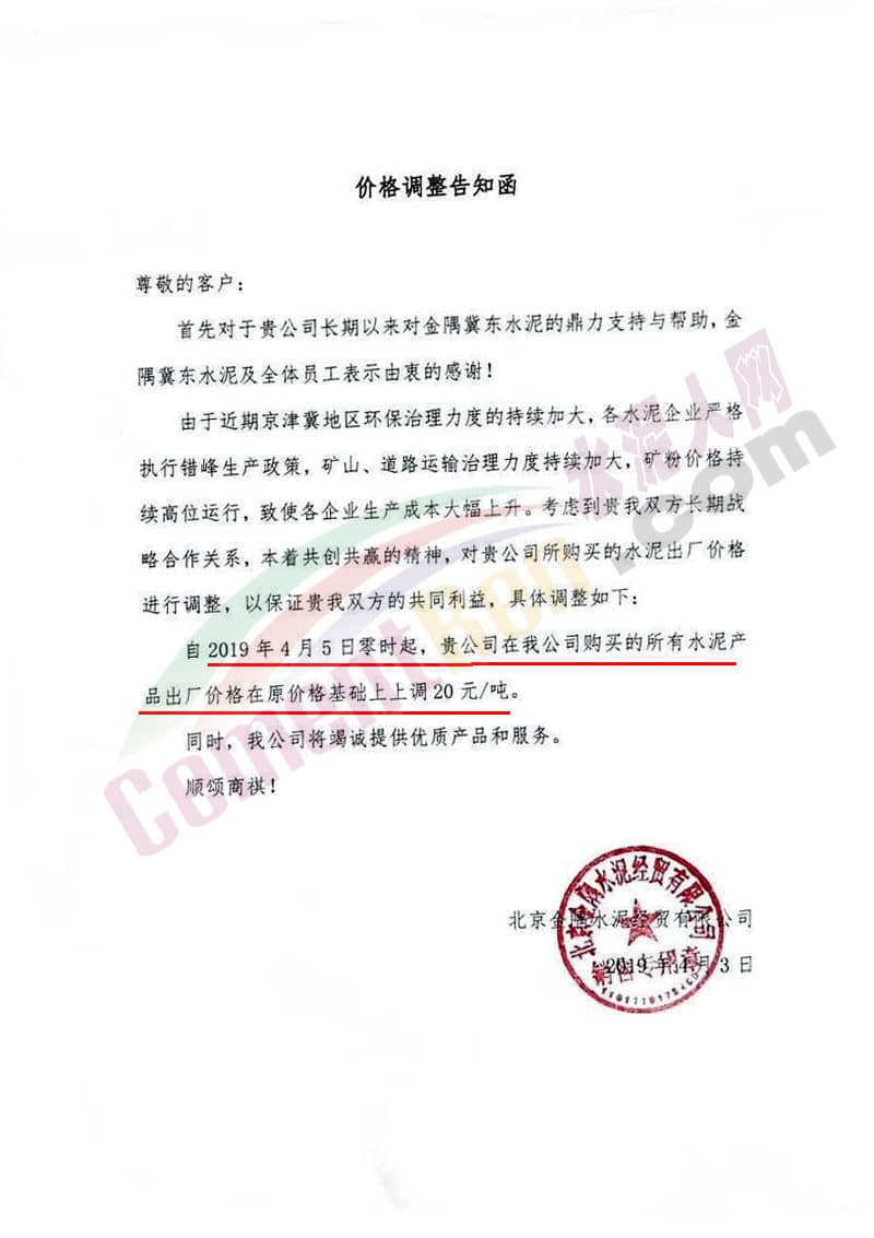 隨著天氣轉(zhuǎn)暖,京津冀區(qū)域的水泥價(jià)格開始上漲。據(jù)水泥人網(wǎng)通知員反饋北京金隅水泥經(jīng)貿(mào)有限公司價(jià)格調(diào)整告知函稱,由于近期京津冀地區(qū)環(huán)保治理力度的持續(xù)加大,各水泥企業(yè)嚴(yán)格執(zhí)行錯(cuò)峰生產(chǎn)政策,礦山、道路運(yùn)輸治理力度持續(xù)加大,礦粉價(jià)格持續(xù)高位運(yùn)行,致使各企業(yè)生產(chǎn)成本大幅上升。自2019年4月5日零時(shí)起,公司所有水泥產(chǎn)品出廠價(jià)格在原價(jià)格基礎(chǔ)上上調(diào)20元/噸。