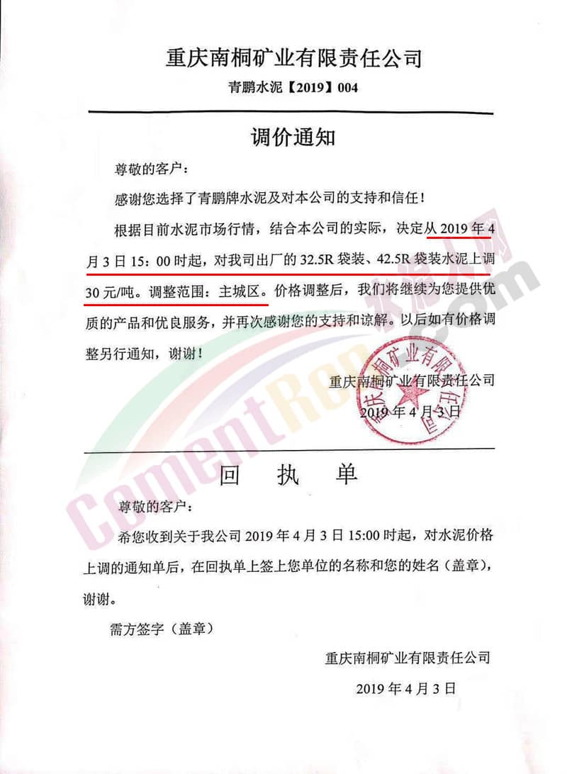 重慶南桐礦業(yè)有限責(zé)任公司調(diào)價(jià)通知稱,根據(jù)目前水泥市場(chǎng)行情,結(jié)合公司實(shí)際,決定從4月3日15:00起對(duì)公司出廠的32.5R袋裝、42.5R袋裝水泥上調(diào)30元/噸。調(diào)整范圍重慶主城區(qū)。