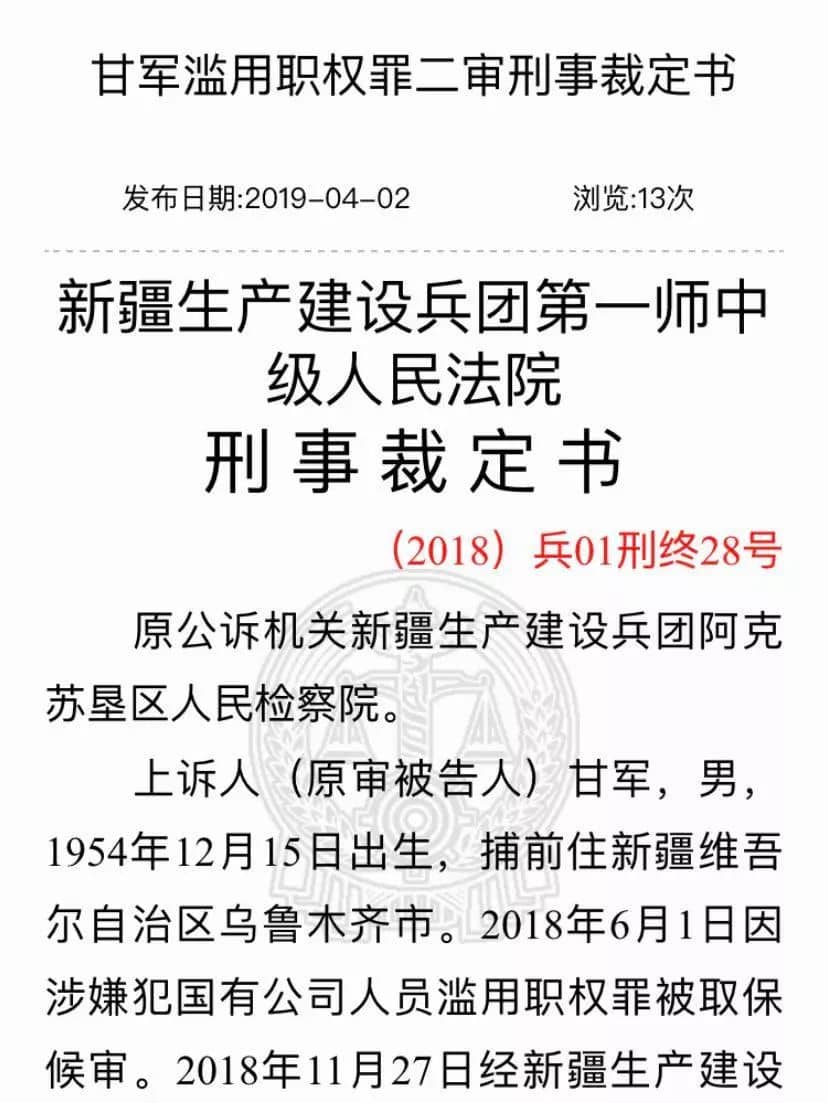 2018年12月,新疆生產(chǎn)建設(shè)兵團(tuán)第一師中級(jí)人民法院駁回了甘軍的上訴,維持原判。