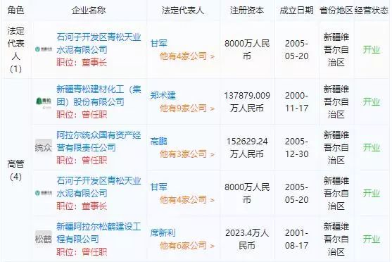 公開(kāi)資料顯示,甘軍于1954年12月出生,本科學(xué)歷,高級(jí)政工師,曾任新疆阿克蘇青松建材化工總廠磷礦政治指導(dǎo)員、團(tuán)委副書記、水泥廠黨委書記、水泥廠第一副廠長(zhǎng)、建化總廠黨委書記,2000年10月起任青松建化董事長(zhǎng)、黨委書記。