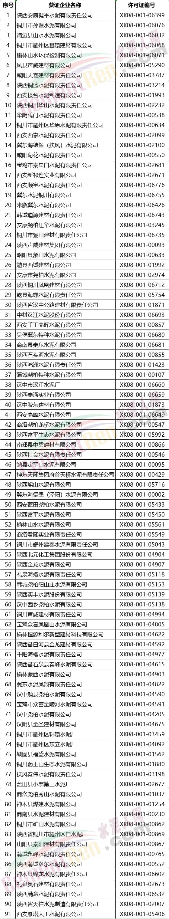 陜西省部分水泥企業(yè)名單