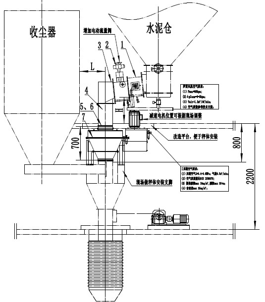 A 在現(xiàn)有的散裝水泥出庫斜槽上增設電動流量調節(jié)閥,放灰下料管位置安裝科里奧利粉體秤,安裝高度約0.73m,并接入壓縮空氣管道用于軸承密封。