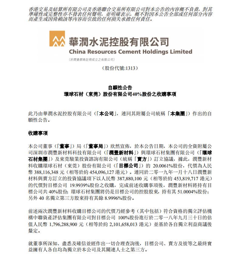 華潤(rùn)水泥控股公告,該公司的全資附屬公司深圳市潤(rùn)豐新材料科技有限公司與環(huán)球石材集團(tuán)有限公司及東莞駿業(yè)投資諮詢有限公司訂立協(xié)議,據(jù)此,潤(rùn)豐新材料收購(gòu)環(huán)球石材(東莞)股份有限公司(目標(biāo)公司)的20.0061%股份,代價(jià)為人民幣3.88億元。