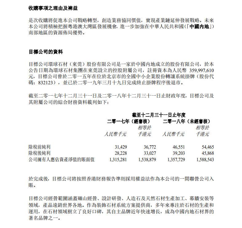 據(jù)悉,目標(biāo)公司環(huán)球石材(東莞)股份有限公司是一家于中國(guó)內(nèi)地成立的股份有限公司,于公告日期為環(huán)球石材集團(tuán)在東莞設(shè)立的控股附屬公司,注冊(cè)資為人民幣3.6億元,目標(biāo)公司曾于2015年在位于北京市的全國(guó)中小企業(yè)股份轉(zhuǎn)讓系統(tǒng)掛牌,并已于2019年3月19日完成終止掛牌程序后退市。