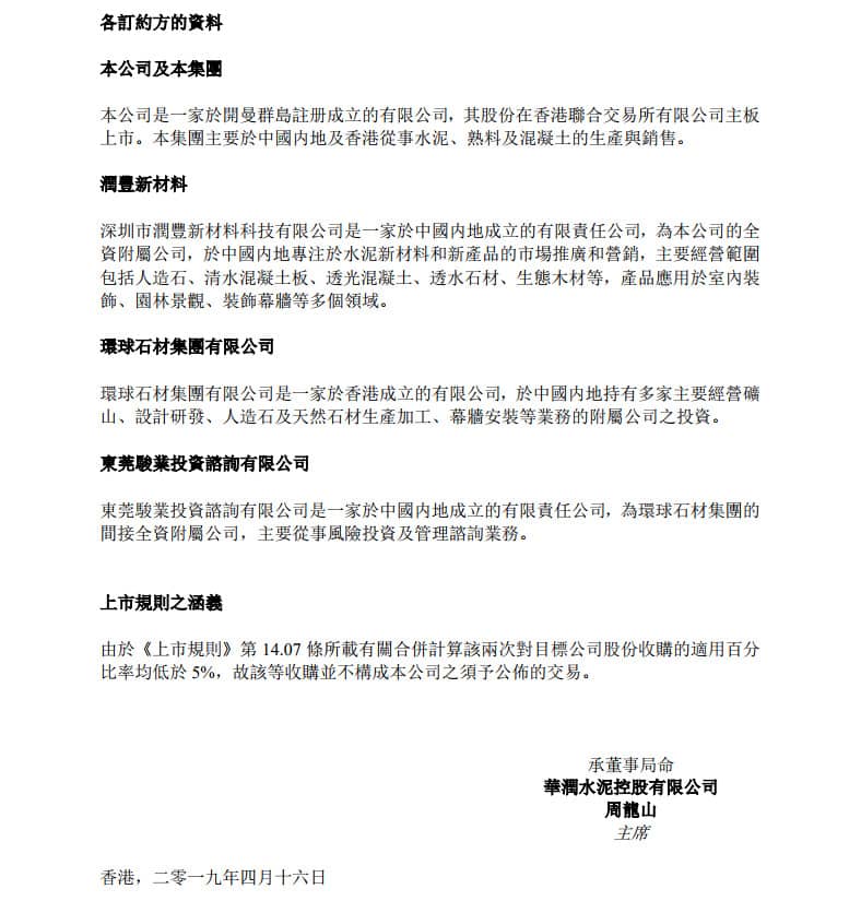連同于2019年1月18日潤(rùn)豐新材料與賣(mài)方訂立的投資協(xié)議項(xiàng)下以人民幣3.88億元的代價(jià)對(duì)目標(biāo)公司19.9939%股份的收購(gòu),完成前述收購(gòu)事項(xiàng)后,潤(rùn)豐新材料將持有目標(biāo)公司共40%股份;環(huán)球石材集團(tuán)將仍是目標(biāo)公司的控股股東,持有其51.0004%股份;另外40名獨(dú)立第三方股東持有其余8.9996%股份。