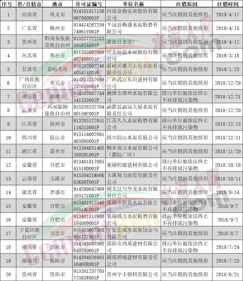 撤銷排污許可證的水泥制造企業(yè)名單