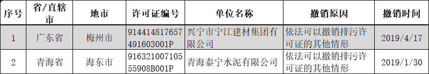 許可證公告撤銷的水泥制造企業(yè)共有兩家,分別為興寧市寧江建材集團(tuán)有限公司和青海泰寧水泥有限公司,撤銷原因?yàn)橐婪梢猿蜂N排污許可證的其他情形。