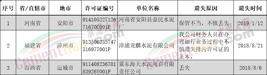 遺失排污許可證的水泥制造企業(yè)名單