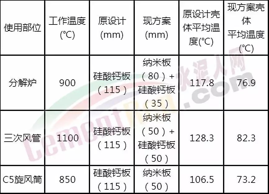 二、如果使用50mm納米板替代115mm硅酸鈣板,每平方米將增加0.065立方米有效容積,5000T/D生產(chǎn)線分解爐面積大約850平方米,則理論上分解爐大約增加850*0.065=55立方米的有效容積。這為水泥窯提高熟料產(chǎn)量提供了最大可能。