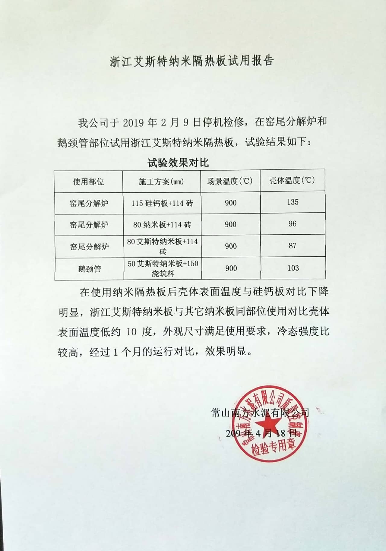 2018年以來(lái),艾斯特納米隔熱材料在南方水泥和華新水泥等大型水泥集團(tuán)逐步推廣應(yīng)用,已得到客戶越來(lái)越多的肯定。納米隔熱材料的使用,給客戶帶來(lái)了非??捎^的經(jīng)濟(jì)效益。以浙江南方區(qū)域某水泥公司為例,使用效果和收益如下: