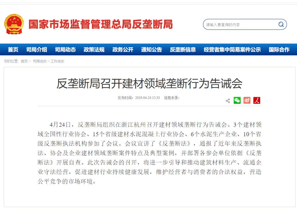 水泥人網(wǎng)消息:昨日(4月24日)國家市場監(jiān)督管理總局反壟斷局發(fā)布《反壟斷局召開建材領(lǐng)域壟斷行為告誡會》的消息稱:反壟斷局組織在浙江杭州召開建材領(lǐng)域壟斷行為告誡會。3個建材領(lǐng)域全國性行業(yè)協(xié)會、15個省級建材水泥混凝土行業(yè)協(xié)會、6個水泥生產(chǎn)企業(yè)(中國建材、海螺水泥、冀東水泥、華潤水泥、華新水泥、山水水泥公司)、10個省級反壟斷執(zhí)法機(jī)構(gòu)參加了會議。