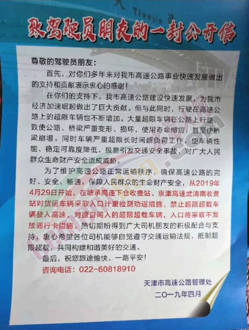 不僅唐山地區(qū)在重點整治超限。日前,天津市高速公路管理處發(fā)布了《致駕駛員朋友的一封公開信》稱自4月29開始,在高速收費站采取入口計量檢測勸返措施,禁止超限超載車輛駛?cè)敫咚佟?/span>