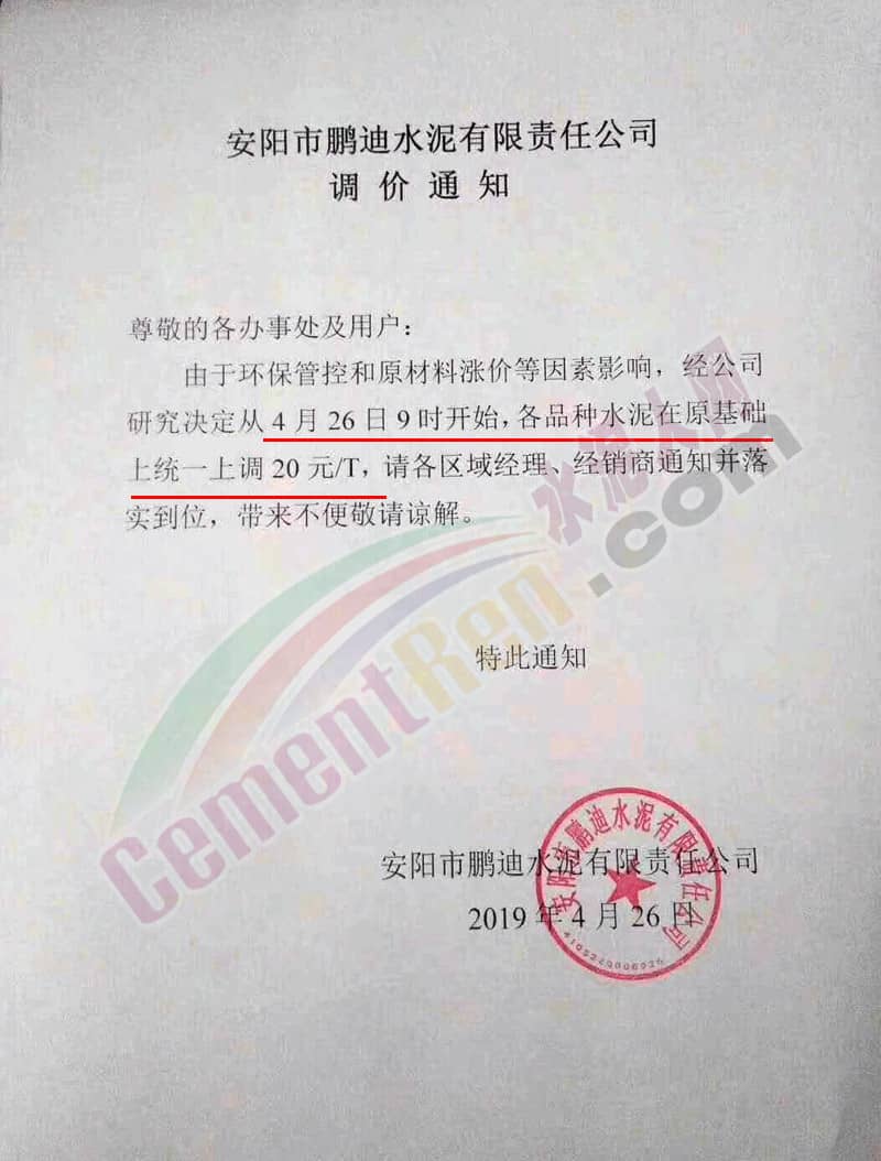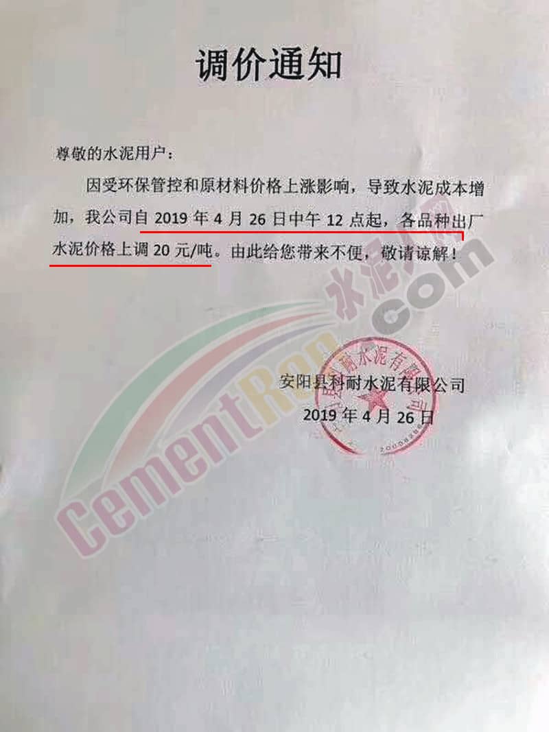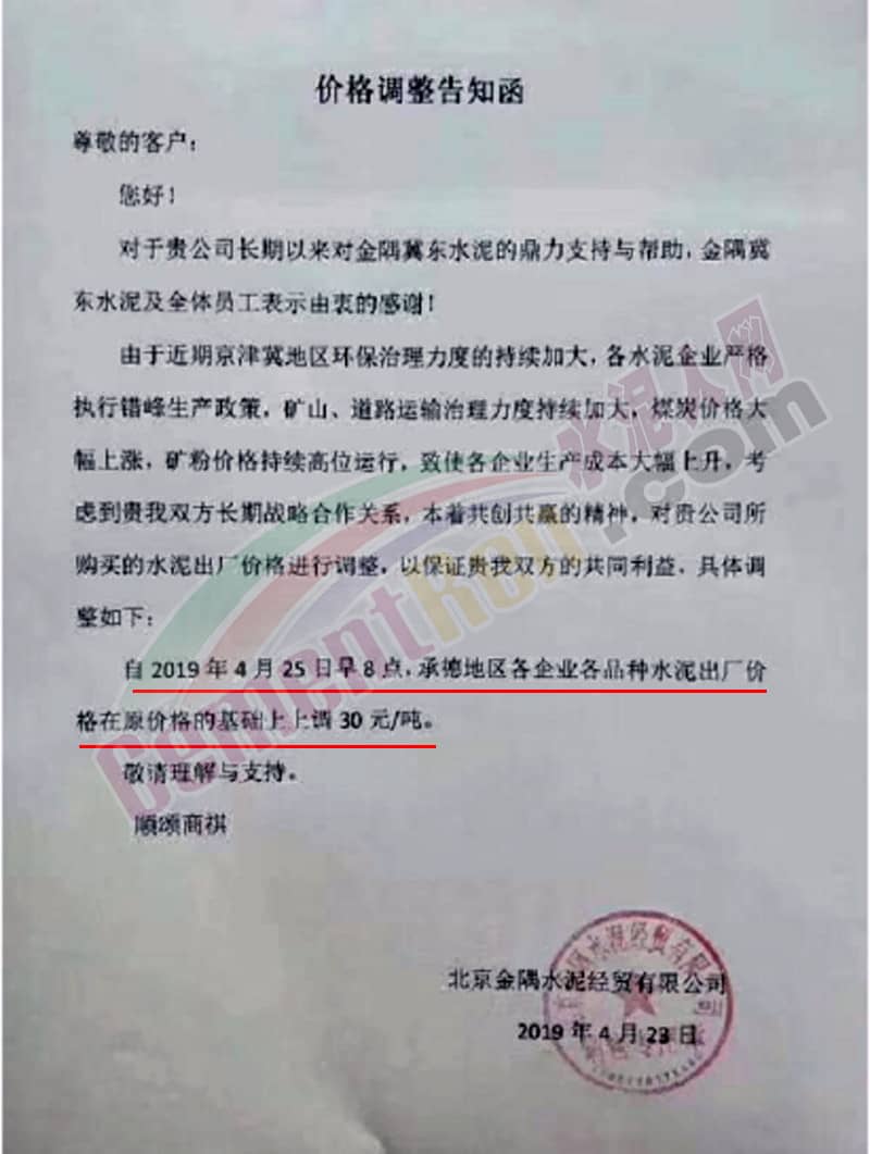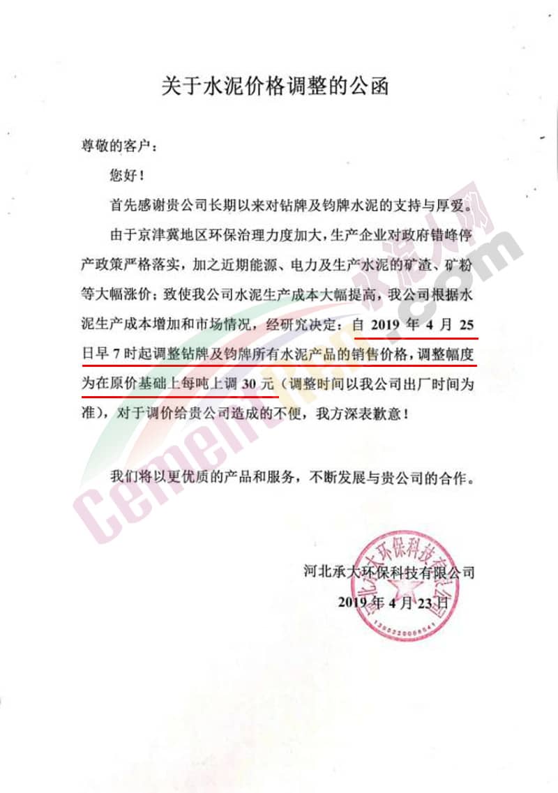 河北承大環(huán)??萍加邢薰?/strong>水泥價格調(diào)整公函稱,由于京津冀地區(qū)環(huán)保治理力度加大,生產(chǎn)企業(yè)對政府錯峰停產(chǎn)政策嚴(yán)格落實,加之近期能源、電力及生產(chǎn)水泥的礦渣、礦粉等大幅漲價;致使公司水泥生產(chǎn)成本大幅提高,公司根據(jù)水泥生產(chǎn)成本增加和市場情況,經(jīng)研究決定自4月25日早7時起調(diào)整鉆牌及鈞牌所有水泥產(chǎn)品的銷售價格,調(diào)整幅度為在原價基礎(chǔ)上每噸上調(diào)30元。