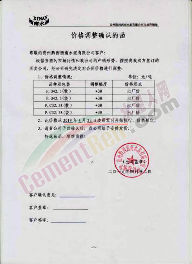 同期,西南地區(qū)貴州省黔西南水泥有限公司市場營銷處發(fā)布價格調(diào)整確認函稱根據(jù)當(dāng)前的市場行情和公司的產(chǎn)銷形勢,各標(biāo)號水泥自23日起上調(diào)30元/噸。