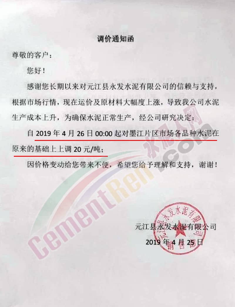 云南元江縣永發(fā)水泥有限公司調(diào)價通知函稱,根據(jù)市場行情,運價及原材料大幅上漲,導(dǎo)致公司水泥生產(chǎn)成本上升,為確保水泥正常生產(chǎn),經(jīng)公司研究決定自4月26日0點起對墨江片區(qū)市場各品種水泥在原來的基礎(chǔ)上上調(diào)20元/噸。