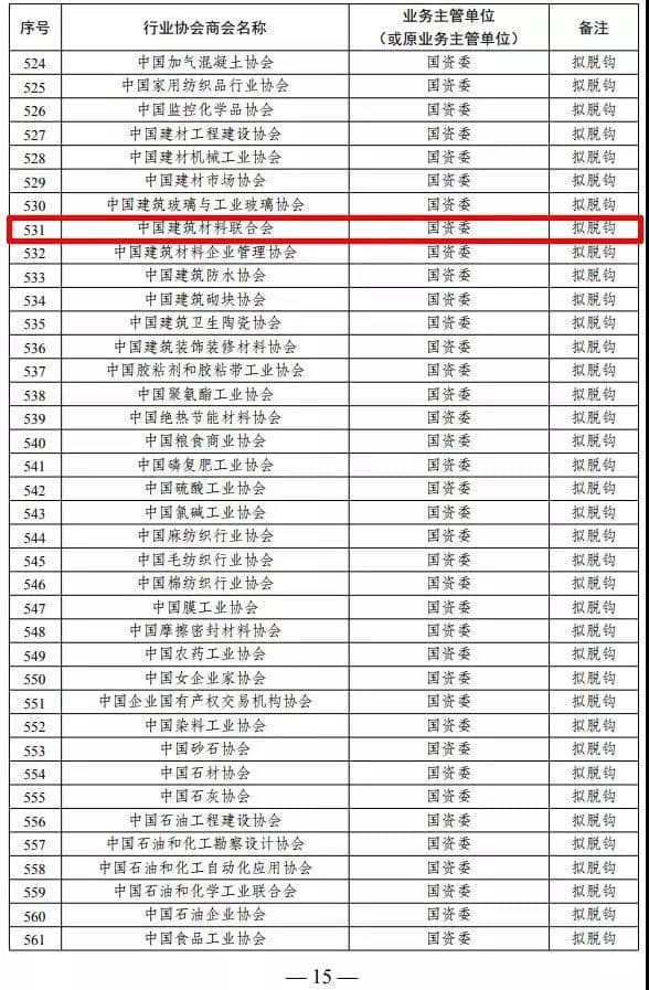 列入脫鉤名單的全國性行業(yè)協(xié)會(huì)商會(huì)(見附件),必須按規(guī)定要求和時(shí)限完成脫鉤。暫未列入脫鉤名單的全國性行業(yè)協(xié)會(huì)商會(huì),暫時(shí)實(shí)行業(yè)務(wù)主管單位和登記管理機(jī)關(guān)雙重管理,同時(shí)按照去行政化的要求,加快推進(jìn)相關(guān)改革。