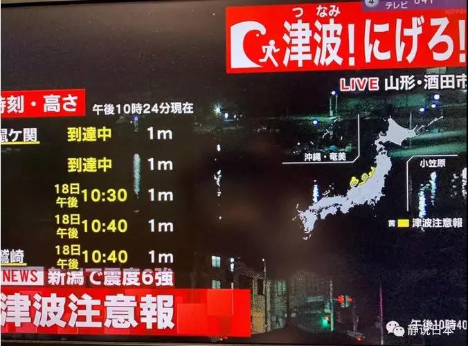 據(jù)報道稱,這次地震是自去年9月,北海道厚真町發(fā)生7級地震以來,日本國內(nèi)發(fā)生的最強(qiáng)烈的地震。日本地震發(fā)生之后日本各大電視臺均取消了預(yù)定節(jié)目的播出,在地震發(fā)生之后5分鐘開始,各大電視臺的屏幕打出了“海嘯!趕快逃命”(津波!にげろ!)的醒目紅字,播音員連續(xù)不斷地呼叫沿海地區(qū)的居民立即逃到高處,不要在海岸邊停留,海嘯不只一次,還可能會出現(xiàn)二次、三次。這樣的呼叫,持續(xù)了近一個小時。
