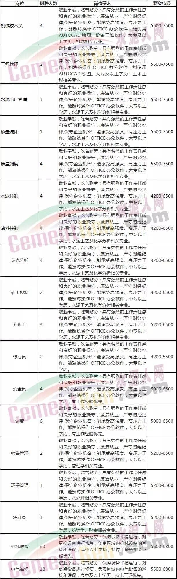 16、化驗室質(zhì)量調(diào)度3人,要求:男女不限,25-30周歲(經(jīng)驗豐富者可以放寬),中專及以上學(xué)歷或有相關(guān)工作經(jīng)歷,水泥工藝專業(yè)或者化學(xué)分析專業(yè),有良好的職業(yè)道德、強烈的企業(yè)認同感和高度的工作責(zé)任心。有一定生產(chǎn)實踐經(jīng)驗,有較強的組織、管理能力。具備對公司產(chǎn)品全過程質(zhì)量進行調(diào)度管理的能力。了解生產(chǎn)工藝流程、掌握公司質(zhì)量管理的各項規(guī)章制度,國家、行業(yè)及企業(yè)標準;熟悉控制崗位安全、技術(shù)操作規(guī)程;熟悉質(zhì)量控制指標、范圍及其控制意義、生產(chǎn)線質(zhì)量控制點;熟悉儀器設(shè)備的使用、校驗、維護保養(yǎng)及簡單故障的處理。試用期工資3000元/月,試用期2-3個月;