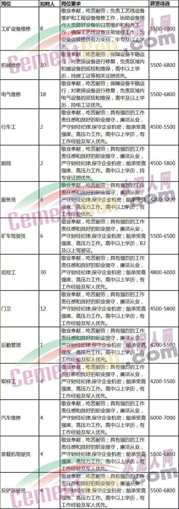 8、設(shè)備巡檢工20人。要求:男女不限,20-45周歲,高中及以上學(xué)歷,熟練掌握電焊、氧焊操作技能,身體健康,有責(zé)任心,適應(yīng)三班輪班制。有水泥廠巡檢維修工作經(jīng)驗者優(yōu)先考慮,試用期工資3000元/月,試用期2-3個月;