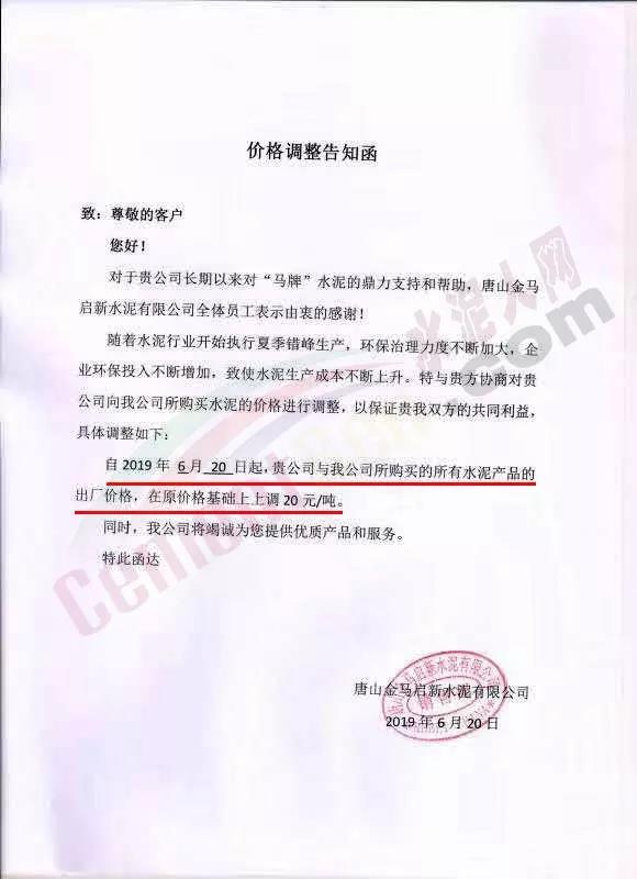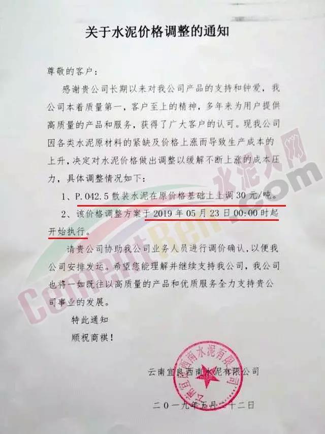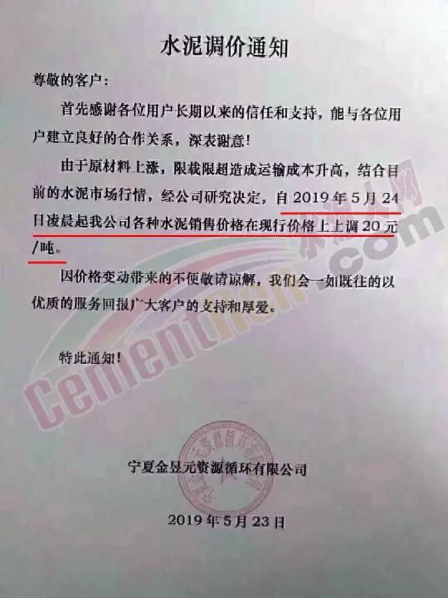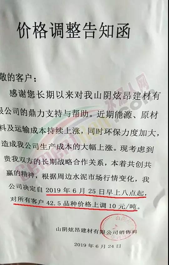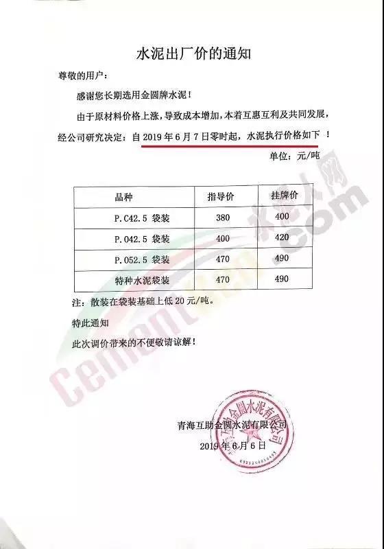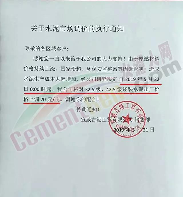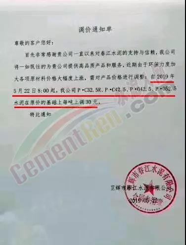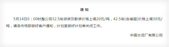 同期,區(qū)域內(nèi)中聯(lián)水泥及海螺水泥全資子公司中國(guó)水泥廠也發(fā)布了調(diào)價(jià)通知。
