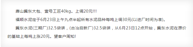 冀東水泥(三期廠)32.5袋裝,(古冶啟新廠)32.5袋裝,從6月23日12點(diǎn)開(kāi)始,冀東水泥在原價(jià)的基礎(chǔ)上每噸上漲20元。望客戶周知!