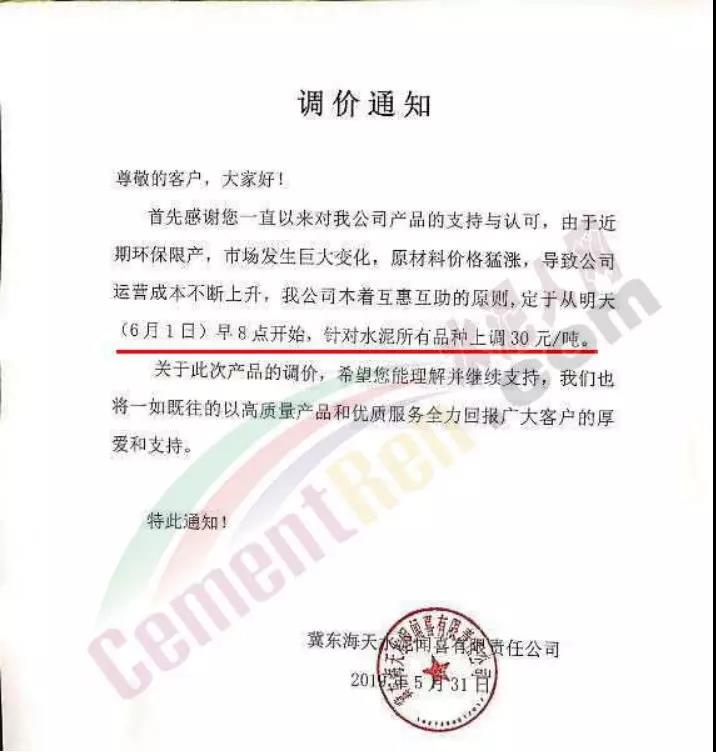 6月1日冀東海天聞喜上調(diào)水泥價(jià)格30元/噸。
