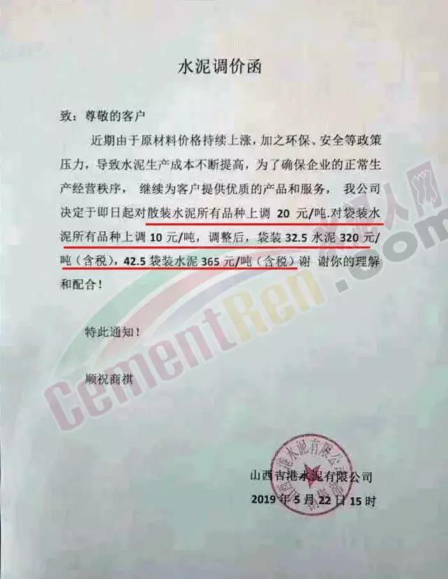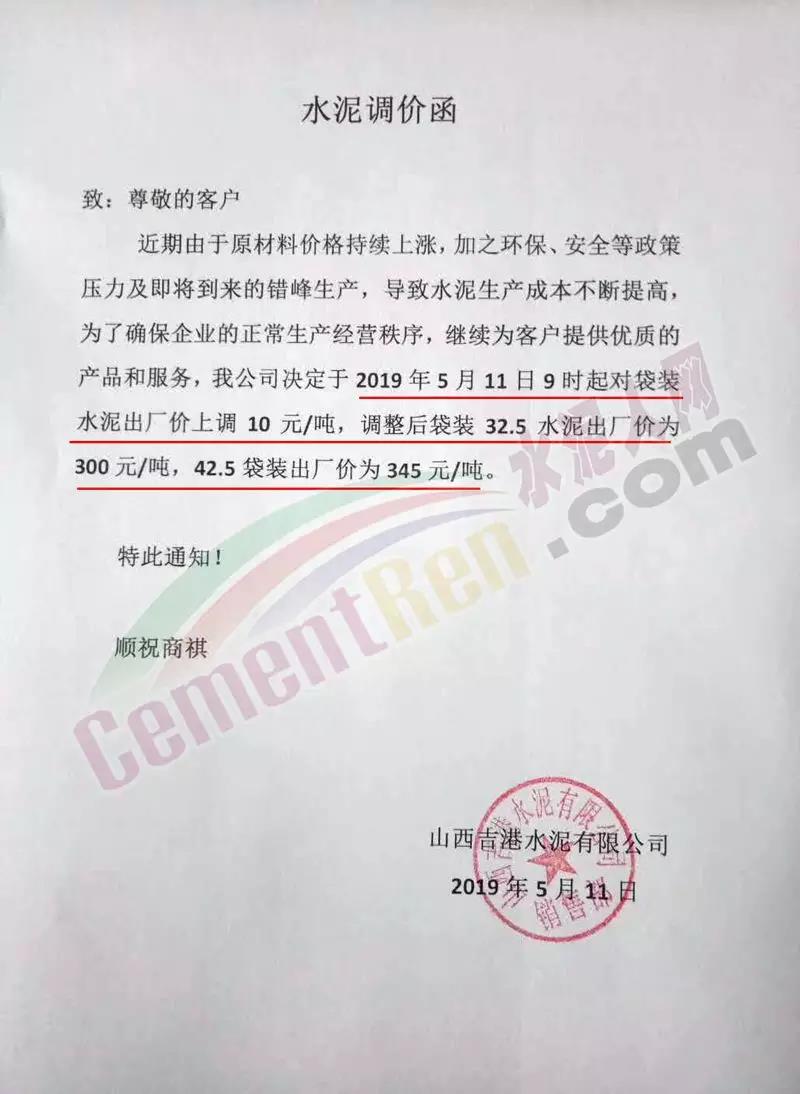 據(jù)水泥人網(wǎng)了解,自5月1日以來(lái),山西省數(shù)十家水泥企業(yè)宣布漲價(jià),漲幅度基本保持在10~20元/噸左右,部分漲價(jià)通知如下: