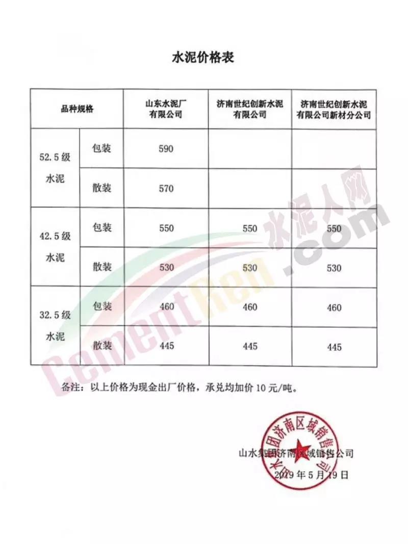 5月19日山水集團(tuán)濟(jì)南區(qū)域銷售公司發(fā)布最新《水泥價(jià)格表》提到山東水泥廠有限公司、濟(jì)南世紀(jì)創(chuàng)新水泥有限公司、濟(jì)南世紀(jì)創(chuàng)新水泥有限公司新材分公司等三家企業(yè)執(zhí)行最新價(jià)格。