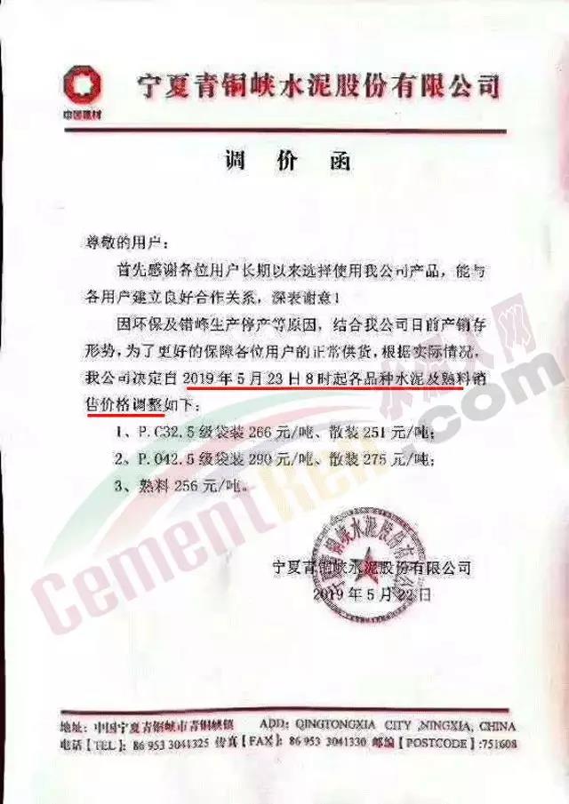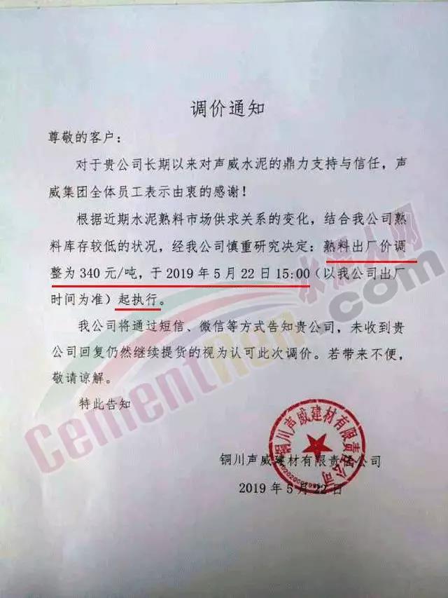 5月22日陜西銅川聲威建材上調(diào)熟料出廠價(jià)格。宜