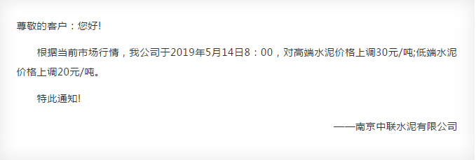 2019年05月15日江蘇省南京市的江南一小野田水泥對(duì)包裝水泥價(jià)格上調(diào)50元/噸,調(diào)整后廠內(nèi)裝車價(jià)650元/噸!