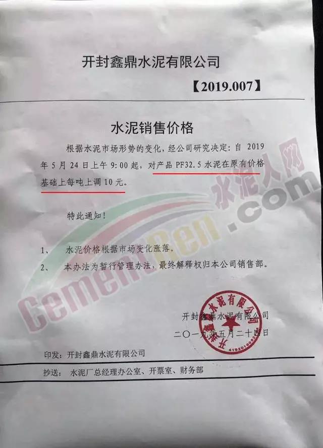 5月24日開(kāi)封鑫鼎水泥上調(diào)10元/噸
