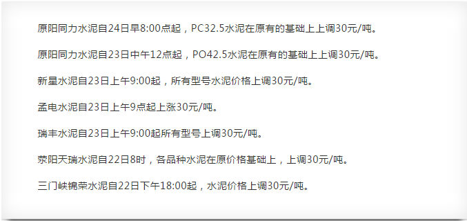 水泥大省河南地區(qū),自5月1日以來(lái),同力水泥、孟電水泥、天瑞水泥、春江水泥等20多家水泥企業(yè)宣布漲價(jià),單次漲價(jià)幅度在30元/噸左右。部分漲價(jià)通知如下: