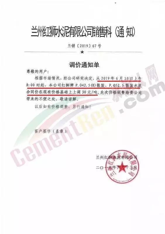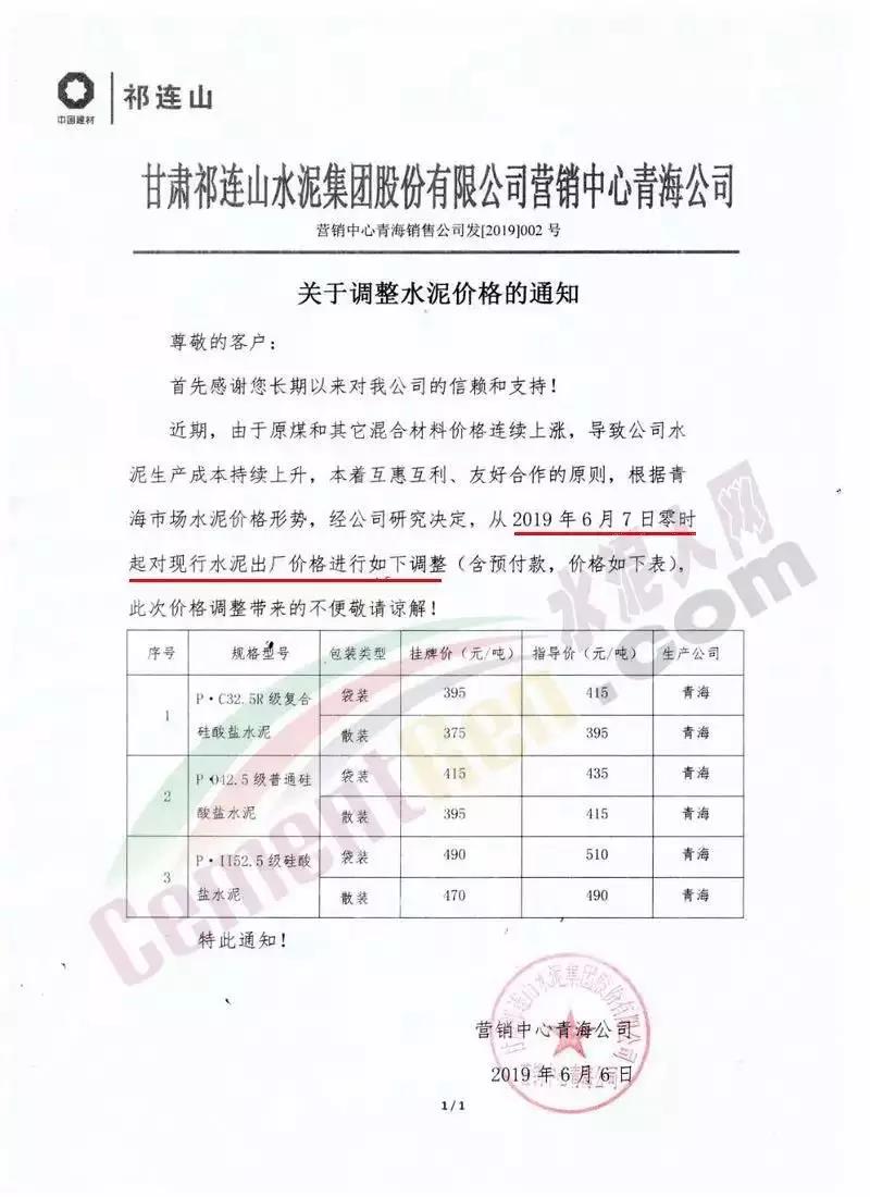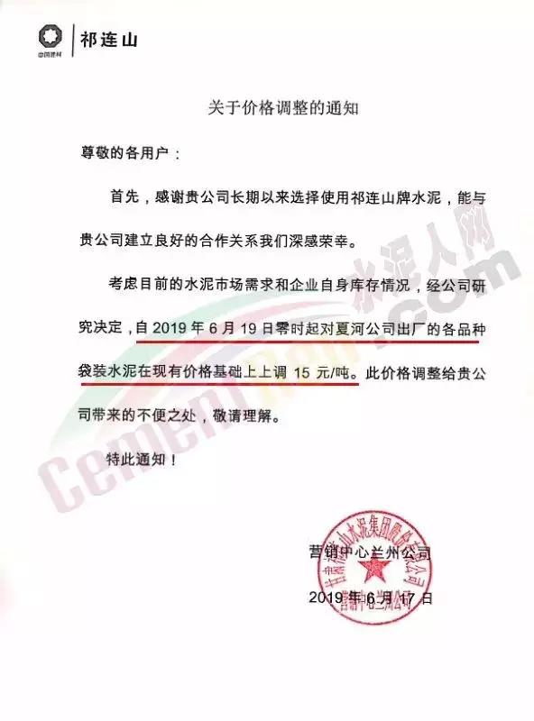 6月19日零時(shí)起甘肅祁連山水泥營(yíng)銷中心蘭州公司對(duì)夏河公司出廠的各品種袋裝水泥在現(xiàn)有價(jià)格基礎(chǔ)上上調(diào)15元/噸。