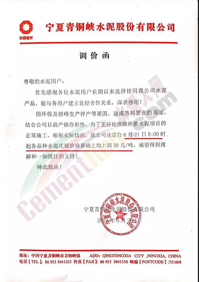 6月下旬,寧夏主導(dǎo)企業(yè)上調(diào)熟料出廠價(jià)格,其中寧夏青銅峽水泥股份有限公司調(diào)價(jià)函稱,因環(huán)保及錯(cuò)峰生產(chǎn)停產(chǎn)等原因,造成熟料緊張的局面,結(jié)合公司目前產(chǎn)銷形勢(shì),根據(jù)實(shí)際情況自6月21日8時(shí)起上調(diào)各品種水泥價(jià)格30元/噸。據(jù)水泥人網(wǎng)了解,5月下旬區(qū)域主導(dǎo)企業(yè)上調(diào)20元/噸。
