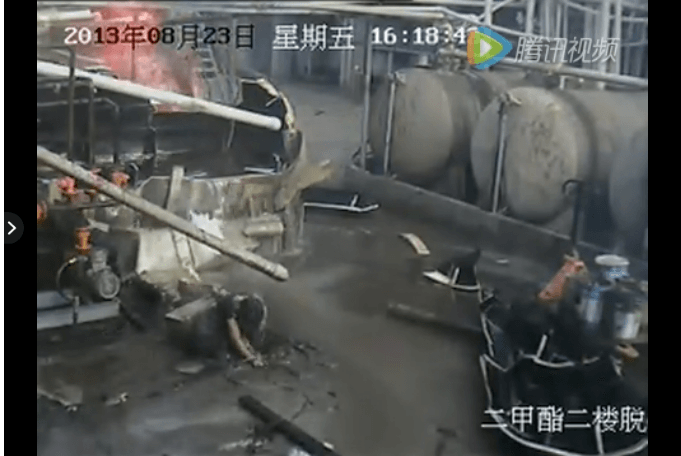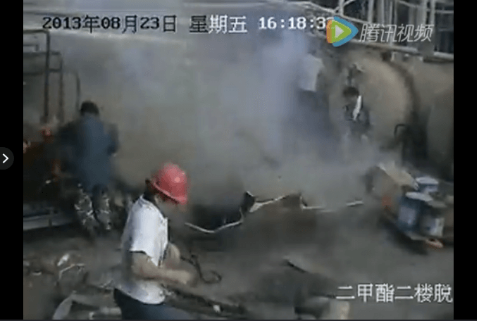 從監(jiān)控視頻可以發(fā)現(xiàn),事故受難者,并非違章動火者本人,而是另外一個隨后過來調(diào)試閥門者。視頻的畫面右下角顯示“二甲酯”字樣。