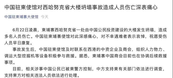 下面是中國(guó)駐柬埔寨大使館官方微信公眾號(hào)的發(fā)文:中國(guó)駐柬使館對(duì)西哈努克省大樓坍塌事故造成人員傷亡深表痛心。