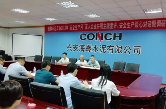 6月24日下午,桂林市總工會黨組成員劉寶成一行到海螺水泥有限公司開展2019年“安全生產(chǎn)月”主題宣講、安全生產(chǎn)談心對話暨調(diào)研活動。
