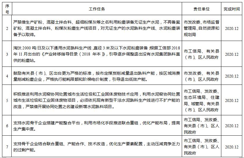 (一)化解過剩產(chǎn)能。嚴禁備案和新建擴大產(chǎn)能的水泥熟料建設(shè)項目,未經(jīng)工業(yè)和信息化部、國家發(fā)展改革委聯(lián)合公告的產(chǎn)能,一律視為違規(guī)產(chǎn)能予以關(guān)停,禁止對現(xiàn)有熟料生產(chǎn)線進行任何形式增加容積的擴能技術(shù)改造。嚴禁借生產(chǎn)礦粉、混凝土拌合料、超細粉煤灰等之名利用粉磨裝備無證生產(chǎn)水泥,不再備案礦粉、混凝土拌合料、粉煤灰粉磨生產(chǎn)線項目,對無證生產(chǎn)的水泥熟料生產(chǎn)線、水泥粉磨裝備予以取締。淘汰2000噸/日及以下通用水泥熟料生產(chǎn)線,直徑3米及以下水泥粉磨裝備;根據(jù)工信部2018年11月出臺的《產(chǎn)業(yè)轉(zhuǎn)移指導(dǎo)目錄(2018年本)》,引導(dǎo)逐步調(diào)整退出沒有水泥集團熟料直供的粉磨站。鼓勵有關(guān)縣(市)、區(qū)出臺更為嚴格的標準,按市定煤炭削減量退出熟料產(chǎn)能,按區(qū)域消費量削減粉磨企業(yè),嚴格執(zhí)行能耗限額和階梯電價制度,引導(dǎo)退出低效產(chǎn)能。積極推進利用水泥窯協(xié)同處置城市生活垃圾和工業(yè)固體廢物技術(shù)應(yīng)用,利用水泥窯協(xié)同處置城市生活垃圾和工業(yè)固體廢物項目,必須依托現(xiàn)有新型干法水泥熟料生產(chǎn)線進行不擴產(chǎn)能的改造,嚴禁借開展協(xié)同處置之名建設(shè)新增水泥熟料項目。支持水泥骨干企業(yè)搭建產(chǎn)能整合平臺,利用市場化手段推進聯(lián)合重組,優(yōu)化產(chǎn)能布局,提高生產(chǎn)集中度。支持骨干企業(yè)結(jié)合聯(lián)合重組、產(chǎn)能合作、技術(shù)改造,優(yōu)化生產(chǎn)要素配置,主動壓減競爭乏力的過剩產(chǎn)能。
