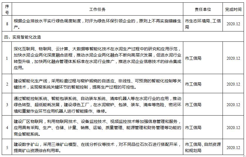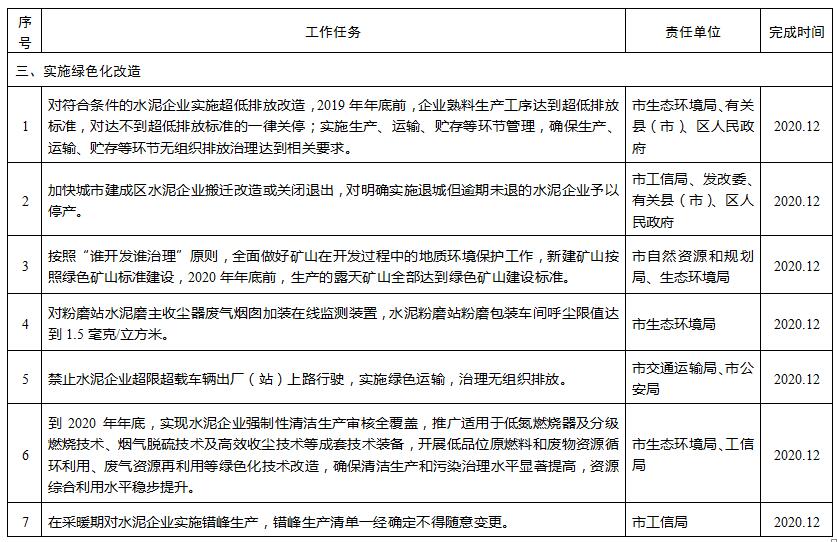 (二)實施綠色化改造。對符合條件的水泥企業(yè)實施超低排放改造,2019年年底前,企業(yè)熟料生產(chǎn)工序達到超低排放標準,對達不到超低排放標準的一律關(guān)停;實施生產(chǎn)、運輸、貯存等環(huán)節(jié)管理,確保生產(chǎn)、運輸、貯存等環(huán)節(jié)無組織排放治理達到相關(guān)要求。加快城市建成區(qū)水泥企業(yè)搬遷改造或關(guān)閉退出,對明確實施退城但逾期未退的水泥企業(yè)予以停產(chǎn)。按照“誰開發(fā)誰治理”原則,全面做好礦山在開發(fā)過程中的地質(zhì)環(huán)境保護工作,新建礦山按照綠色礦山標準建設(shè),2020年年底前,生產(chǎn)的露天礦山全部達到綠色礦山建設(shè)標準。對粉磨站水泥磨主收塵器廢氣煙囪加裝在線監(jiān)測裝置,水泥粉磨站粉磨包裝車間呼塵限值達到1.5毫克/立方米。禁止水泥企業(yè)超限超載車輛出廠(站)上路行駛,實施綠色運輸,治理無組織排放。到2020年年底,實現(xiàn)水泥企業(yè)強制性清潔生產(chǎn)審核全覆蓋,推廣適用于低氮燃燒器及分級燃燒技術(shù)、煙氣脫硫技術(shù)及高效收塵技術(shù)等成套技術(shù)裝備,開展低品位原燃料和廢物資源循環(huán)利用、廢氣資源再利用等綠色化技術(shù)改造,確保清潔生產(chǎn)和污染治理水平顯著提高,資源綜合利用水平穩(wěn)步提升。在采暖期對水泥企業(yè)實施錯峰生產(chǎn),錯峰生產(chǎn)清單一經(jīng)確定不得隨意變更。根據(jù)企業(yè)排放水平實行綠色調(diào)度制度,對評為綠色環(huán)保引領(lǐng)企業(yè)的,原則上不再實施錯峰生產(chǎn)。