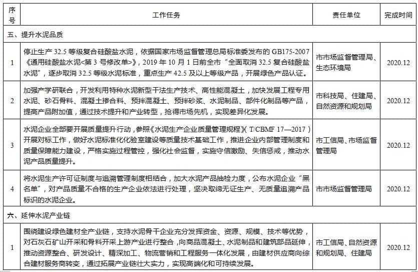 (四)提升水泥品質(zhì)。停止生產(chǎn)32.5等級復(fù)合硅酸鹽水泥,依據(jù)國家市場監(jiān)督管理總局標準委發(fā)布的GB175-2007《通用硅酸鹽水泥〈第3號修改單〉》,2019年10月1日前全市“全面取消32.5復(fù)合硅酸鹽水泥”,逐步取消32.5等級水泥標準,重點生產(chǎn)42.5及以上等級產(chǎn)品,開展綠色產(chǎn)品認證。加強產(chǎn)學研聯(lián)合,開發(fā)利用特種水泥新型干法生產(chǎn)技術(shù)、高性能混凝土,加快發(fā)展工程專用水泥、砂石骨料、混凝土摻合料、預(yù)拌混凝土、預(yù)拌砂漿、水泥制品、部件化制品等產(chǎn)品,提高產(chǎn)品附加值,通過技術(shù)提升和產(chǎn)業(yè)轉(zhuǎn)型,搶得市場先機,實現(xiàn)差異化發(fā)展。水泥企業(yè)全部要開展質(zhì)量提升行動,參照《水泥生產(chǎn)企業(yè)質(zhì)量管理規(guī)程》(T/CBMF17—2017)開展對標工作,做好水泥標準化化驗室建設(shè)等質(zhì)量技術(shù)基礎(chǔ)工作,推進企業(yè)內(nèi)部管理制度和質(zhì)量保障能力建設(shè),嚴格實施過程管控,強化社會監(jiān)督,實施守信激勵、失信懲戒,推動水泥產(chǎn)品質(zhì)量提升。將水泥生產(chǎn)許可證制度與追溯管理制度相結(jié)合,加大水泥產(chǎn)品抽檢力度,公布水泥企業(yè)“黑名單”,對產(chǎn)品質(zhì)量不合格的生產(chǎn)企業(yè)依法進行處理,堅決取締無證生產(chǎn)、無質(zhì)量追溯產(chǎn)品標識的水泥企業(yè)。